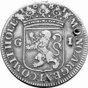 The coin to the left was issued in 1681 by the states of Holland and Friesland, of the Dutch Republic. It was a silver guilder design sporting the lion from the coat of arms of Holland. The coin to the right was issued by the Netherlands in 1973, and was I believe the penultimate design.