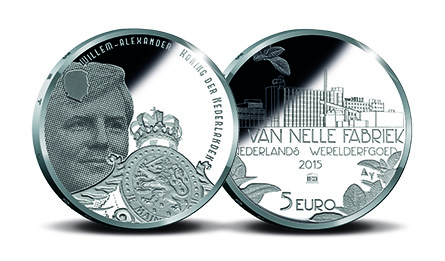 Three different versions of the coin are available, a Proof .900 fine gold €10 coin (1,500 coins), a Proof .925 fine sterling silver €5 coin (12,500 coins, shown here) and a Brilliant Uncirculated silver-plated copper €5 coin (250,000 coins). The coin features King Willem Alexander on one side and the factory on the other.