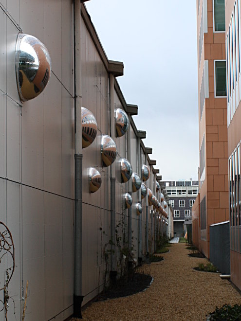 During a walk today cut short prematurely by the rain I came across these reflective spheres which are attached to a wall along a gated alley just off the Skutsjespad, across the ING head office. Does anyone know what they are there for? My guess is it’s some sort of art installation so that the people in the office building to the right have something more interesting to stare at than a blank wall. (You can see the ING House in the reflection of the left most ball.)